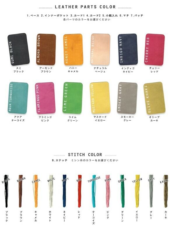 ① 1.ベース/2.インナーポケット/3.カード1/4.カード2/5.小銭入れ/6.マチ/7.パッチ/8.ステッチのカラーをお選びください。