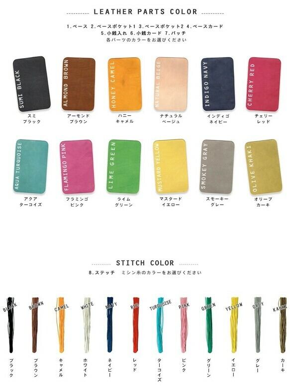 ① 1.ベース/2.ベースポケット1/3.ベースポケット2/4.ベースカード/5.小銭入れ/6.小銭カード/7.パッチ/8.ステッチのカラーをお選びください。